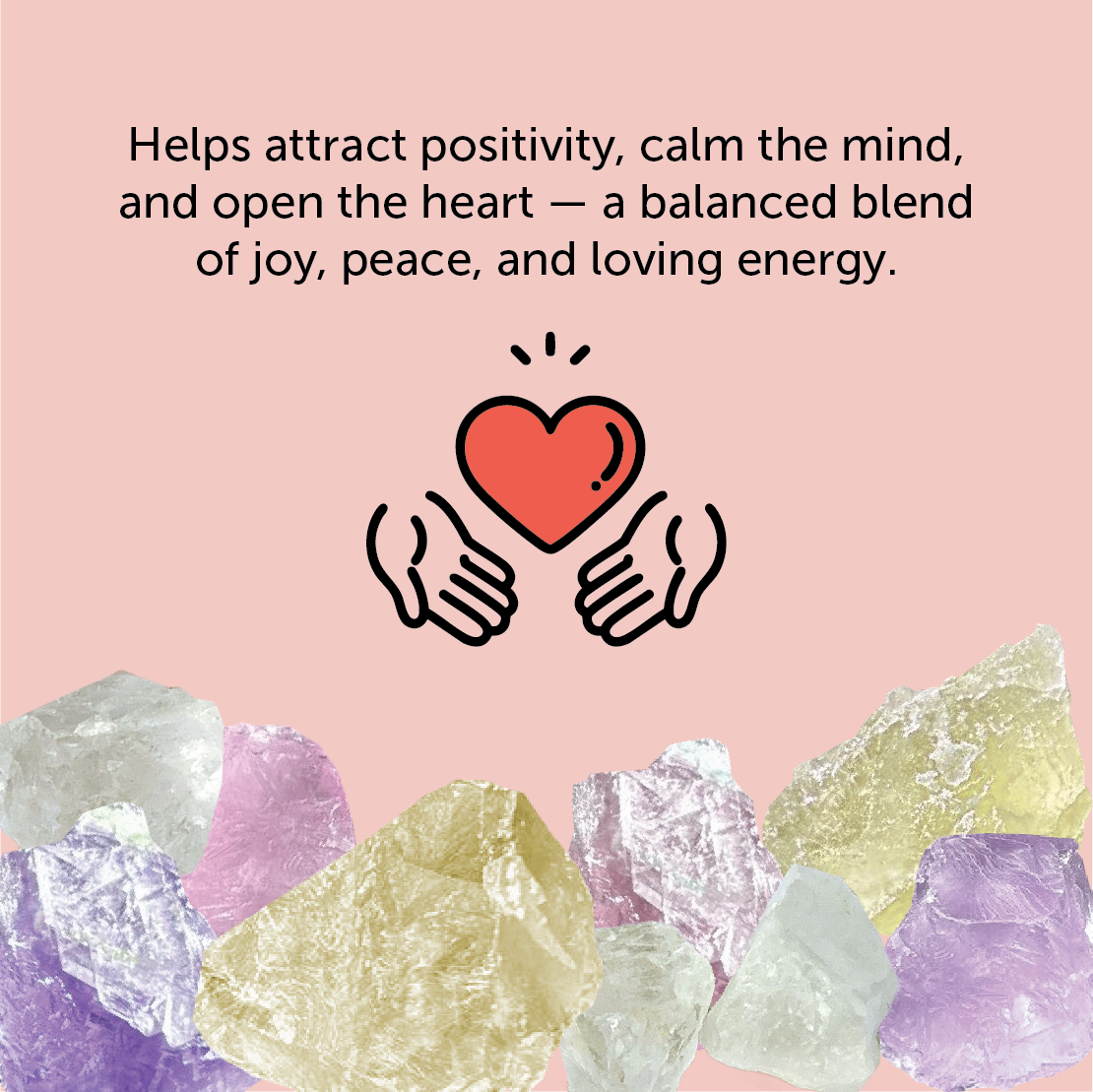 Unicorn Glow: Amethyst, Rose Quartz, and Citrine – a balanced blend that attracts positivity, calms the mind, and opens the heart, promoting joy, peace, and loving energy.