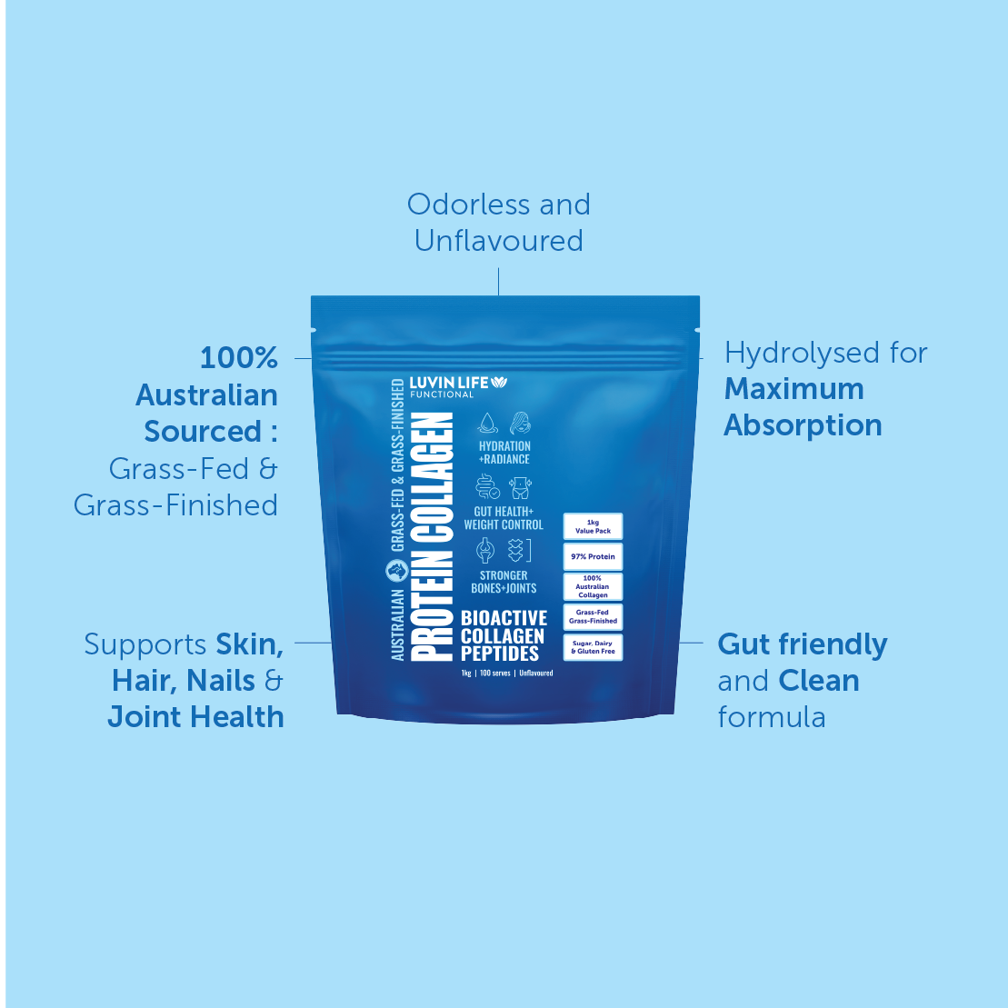 Collagen supplements are commonly used to support healthy skin, hair, nails, joints, and gut function. As we age, natural collagen levels decline, and supplementing with hydrolysed collagen peptides may help maintain skin elasticity, support strong nails, and promote a healthy appearance. Many people also use collagen to help keep their joints comfortable and mobile. Because collagen peptides are easily absorbed, they’re a convenient daily way to support overall wellbeing.