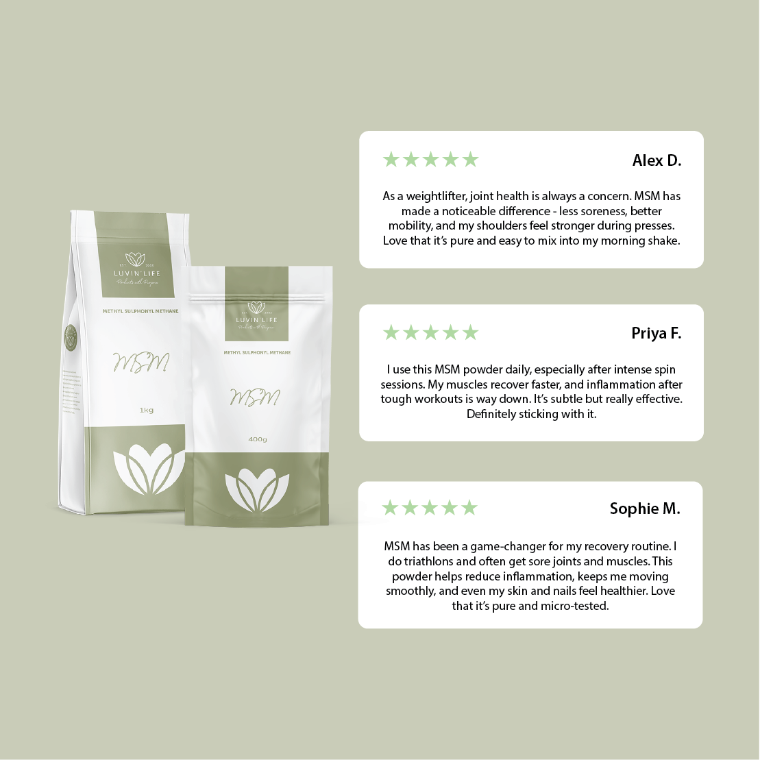 Thank you for such a wonderful product. I have been using MSM Powder since well before COVID, because of a Lung problem, and while I have kept using it, I have never had a cold virus or Flu. My husband & I did not have the Vaccine because of our health problems, and during the COVID period we never contracted the virus and have stayed free while taking MSM Powder. I would never be without it. Carolyn English